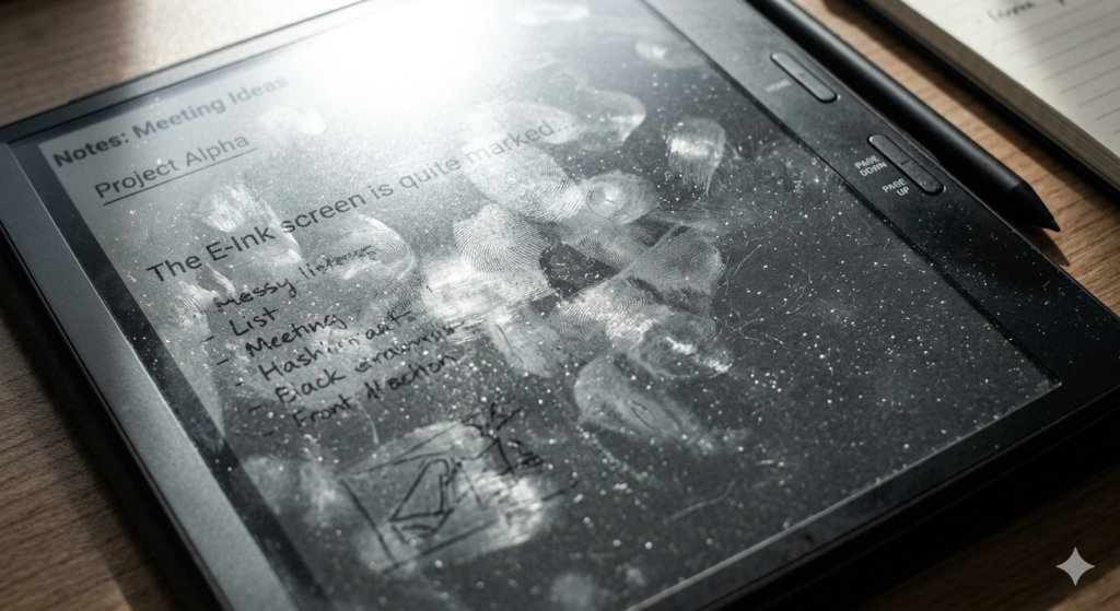 When removing fingerprints, let the microfiber material do the heavy lifting. Pressing down aggressively on an E-Ink screen can actually damage the microcapsules beneath the surface, leading to dead pixels.