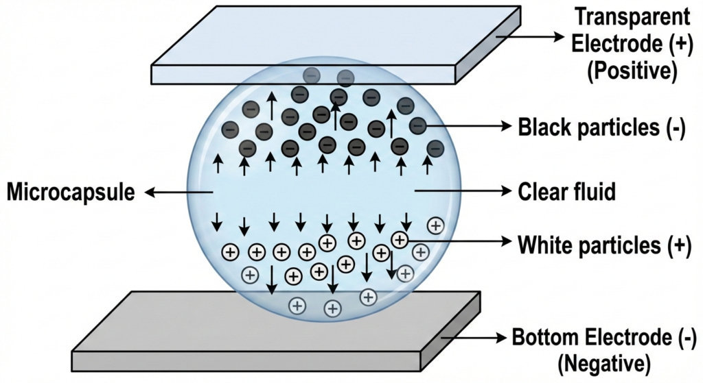 The scientific term for the mechanism behind E-Ink is an "electrophoretic display." This sounds complex, but the principle is based on simple magnetism and electrical charges.